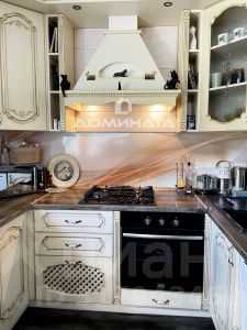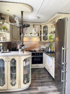 Кухонный гарнитур оборудован газовой варочной поверхностью, эл.духовкой, ПММ, МВП, вытяжкой, раковина - камень