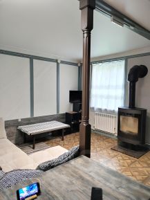 На первом этаже кухня гостиная с камином, амин топиться дровами поворотный.