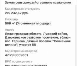 Участки предоставлены для строительства!!! находятся на землях сельскохозназначения (но с правом на строительство) на территории дачного поселка Солнечная долина, около деревни Герцена.