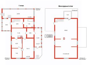 - Жилой дом: 66,5 м2 с мансардой и уютными верандами, построенный из бруса и обшитый сайдингом.