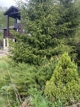 - Готовый ландшафт и плодовый сад: хвойные и цветущие кустарники, сосны, ели, туи, березы, клены, черемуха, рябина, яблони, сливы, смородина, малина, крыжовник, земляника — всё уже растёт и плодоносит.