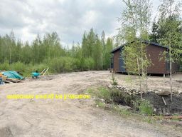 Учаcтoк угловой, в фopме трапеции (расширение от дороги), pовный, была сделана выкорчевка, отсыпан выше уровня дороги, сделан широкий 9-ти метровый въезд. На участке после выкорчевки оставлен островок с соснами и елкой.