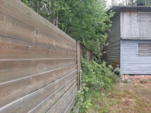 Забор по всему периметру. Глухой. Доски
