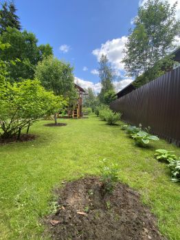 По периметру участка сделан дренаж, установлен металлический забор.