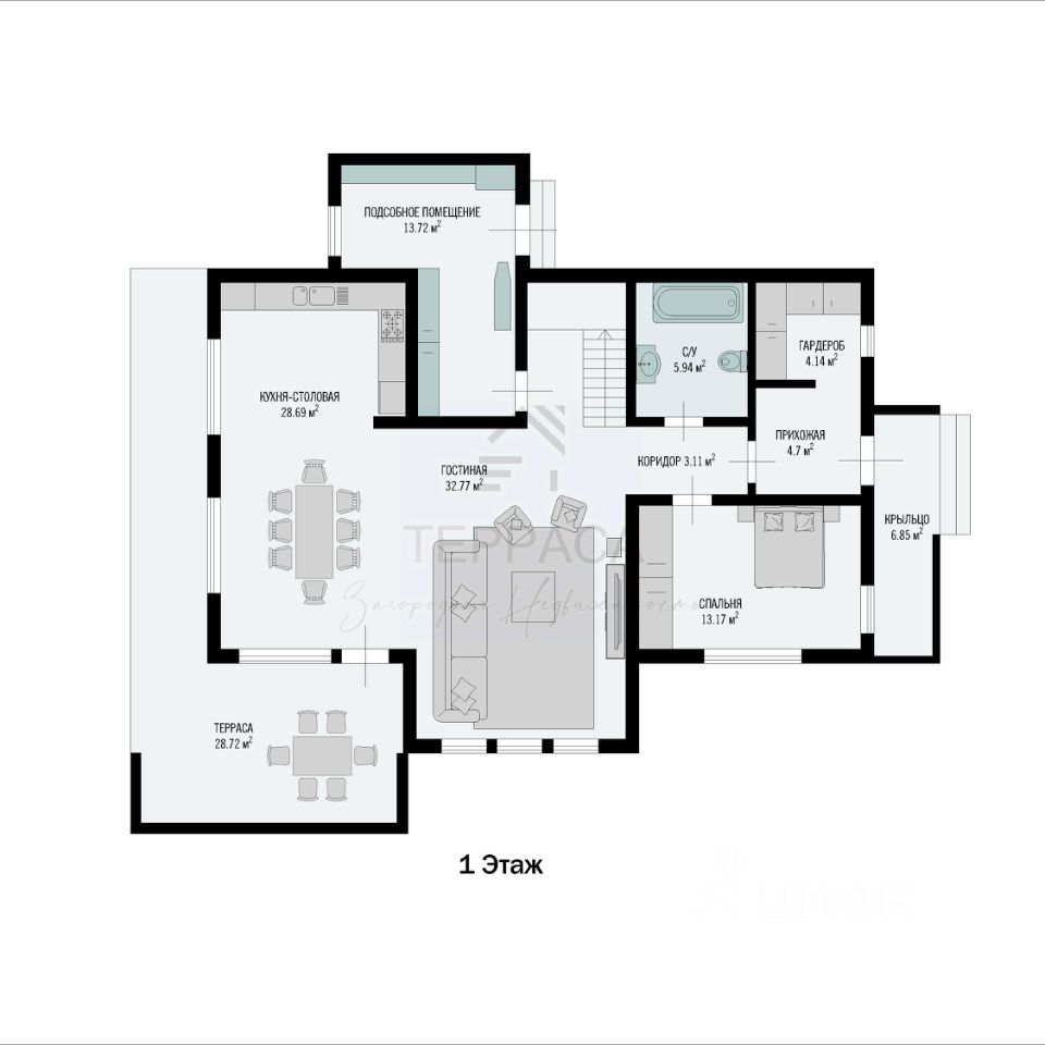 1 этаж - гостиная со вторым светом, кухня-столовая с выходом на большую террасу, изолированная комната, прихожая, гардеробная, котельная, с/у.