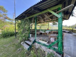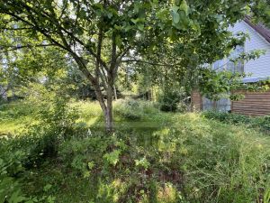 Участок ровный, сухой, огорожен забором, граничит с лесом. Много плодовых кустов и деревьев, теплица.