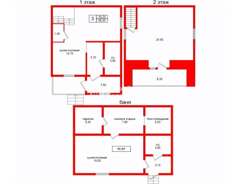 Дом двухэтажный, на 1 этаже крыльцо, техническое помещение, сан узел, кухня, гостиная и кладовка. На втором этаже комната с балконом. В бане кухня-гостиная 19 кв.м., раздельный санузел, техническое помещение, парилка. Так же пригодна для круглогодичного проживания.