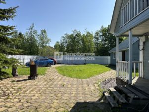 Автоматические ворота, место для нескольких машин. По периметру забор. На участке придомовой территории газон, садовые дорожки, мангальная зона и выход к небольшому пруду.