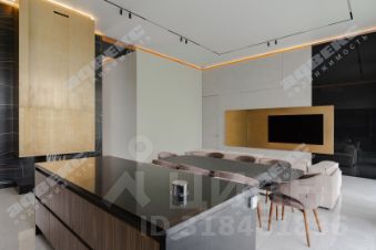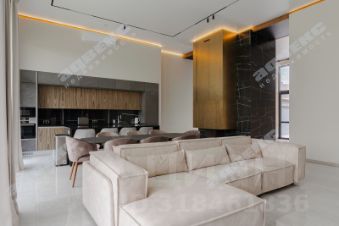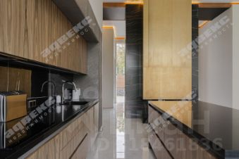 Кухонная зона состоит из обеденно-рабочего островка и полностью укомплектованного всей необходимой бытовой техникой и оборудованием , гарнитура .