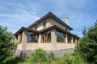 Основной дом 397 м2 для семейного проживания. Три жилых этажа. Гостиная 75 м2, зимний сад, отдельная кухня, камин, четыре спальни, три санузла с душевыми. Цокольный этаж для спорта (использовался как бильярдная и зал для настольного тенниса), большая кладовая. Требуется косметический ремонт.