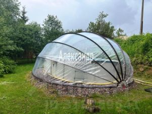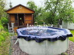 Сруб 6х4 на сваях+ небольшая терраса. Цоколь отделан ПВХ-панелями, дерево обработано пинотексом. Печь Ермак 16ПС, с кирпичной кладкой и выносным баком. Двери стеклянные в парной и в помывочной. Пологи и отделка стен в парной сделаны из липы сорт Экстра. Каркасный бассейн 18м3 на песчаной подушке и пеноплексе под куполом, для защиты от грязи и повышения температуры воды.