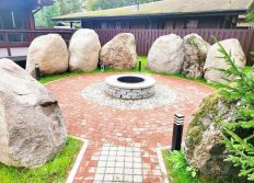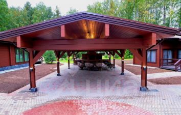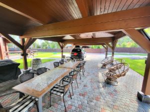 Между жилыми строениями расположена барбекю зона с каминным комплексом и парковочная площадка для авто, катера, квадроцикла или снегохода. Установлен навес общей площадью 132 кв. метра.