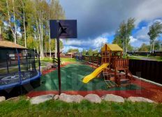 На ограждённой территории усадьбы организованы детская и спортивная площадки. Детская площадка покрыта безопасным резиновым покрытием. Спортивная площадка гармонично вливается в закрытую берёзовую рощу. Имеется хоз.блок и дровник.