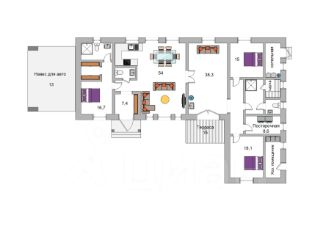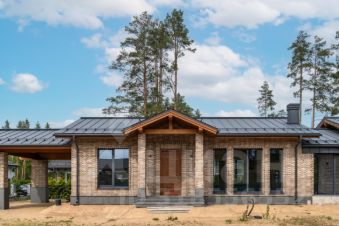 В доме расположены просторная кухня-гостиная площадью 54 кв.м., мастер-спальня с гардеробной и санузлом, две гостевые комнаты, спа зона с сауной, санузлом и комнатой отдыха, мангальная зона с террасой, постирочная комната, хозблок, котельная и навес на два автомобиля. Таким образом, зоны различного назначения объединены под единой кровлей.
