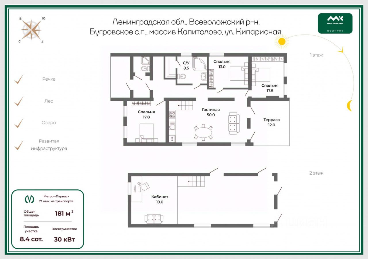 5 км от города, Ж/Д станция "Капитолово" в шаговой доступности (10 мин до "Девяткино"), автобус до метро "Парнас".