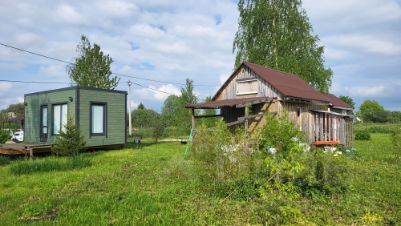На втором участке имеется гостевой домик размерами 6,2х3,2 (модульный дом зеленого цвета на фото) год постройки 2023 со всеми коммуникациями, подходит для круглогодичного проживания, жилая площадь 15,3 кв. м(электричество 10 кВт, водоснабжение, водоотведение в септик отдельно от основного дома, внутри выполнена чистовая отделка, разводка электричества, хвс, гвс, установлен санузел, душевая кабина, бойлер на 30 литров, отопление электрическое), панорамные окна 2-х камерные). Дом установлен на свайно-винтовой фундамент, имеется открытая терраса 6х3 м.