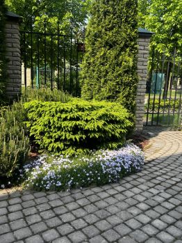 На участке тротуарная плитка, туи, декоративные хвойные растения, сад (черешни, вишня, яблоня, смородина, крыжовник), розы. Выполнен ландшафтный дизайн.