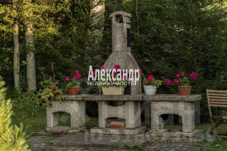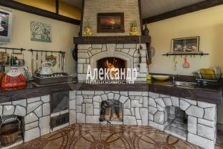Земельном участок, ровный, ухоженный, правильной формы, прекрасный газон, спортивный уголок где можно поиграть в волейбол, гриль зона и летняя кухня, в которой расположился мраморный стол и дизайнерские стулья, мраморный камин и плита, телевизор и холодильник, панорамные окна создают единение с природой и уют .