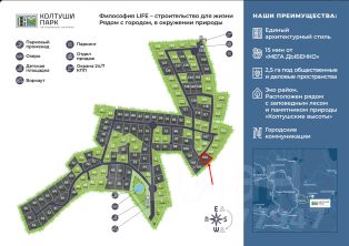 С тыльной стороны участка проходит ЛЭП (110 кВ), благодаря чему только два соседних участка по бокам. Сзади — гарантированная зелёная зона без застройки.