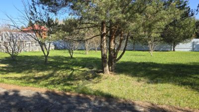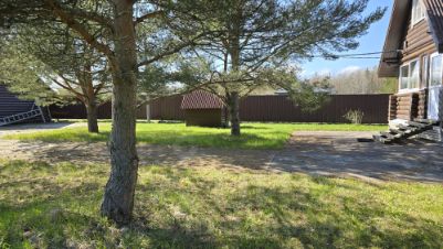 Участок огорожен со всех сторон забором из металлопрофиля, есть распашные ворота и две калитки. Часть территории выложена тротуарной плиткой, на другой части высажены сосны, яблони и груши, газон и ягодные кустарники.