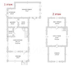 На первом этаже веранда, кухня-гостиная, санузел, душевая и сауна. На втором этаже две спальни и холл. Оба этажа отапливаются. Так же к дому пристроены котельная и комната отдыха с камином, бильярдом и чашей для бассейна.