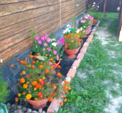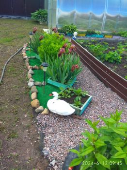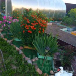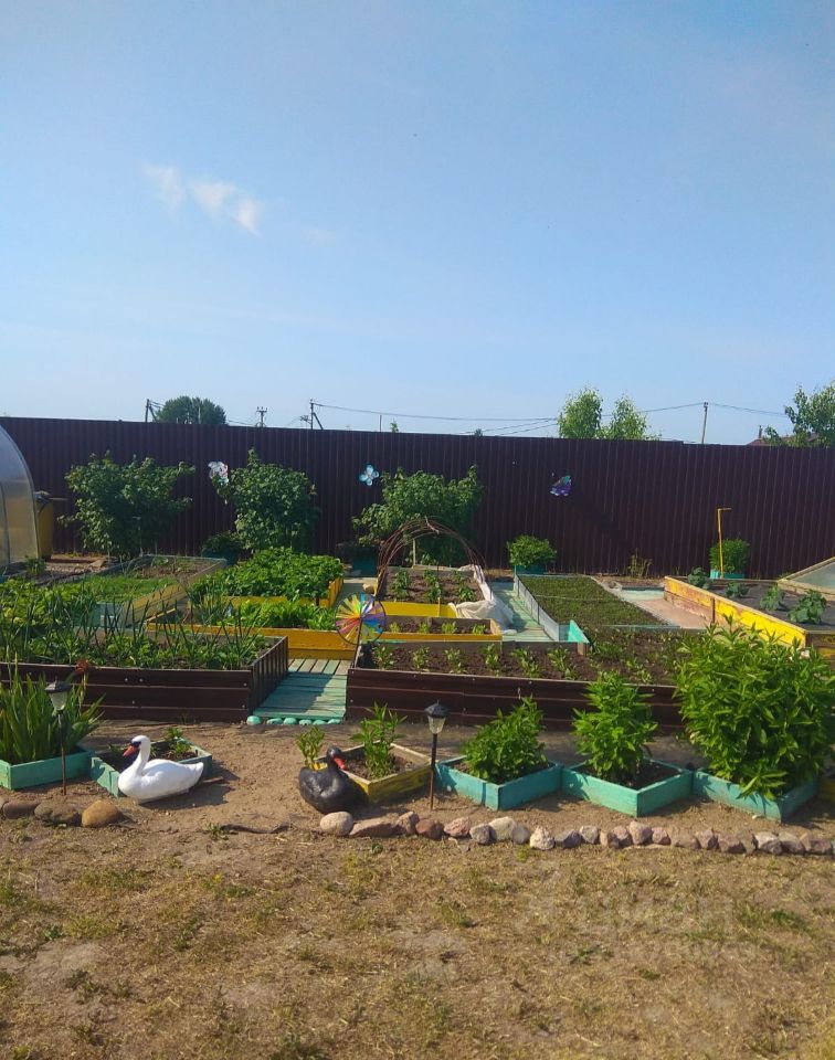 Посажены помидоры, огурцы, зелень, овощи, много цветов, яблоня