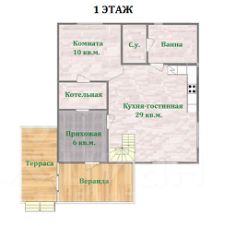 - На первом этаже: кухня-гостиная 29 кв.м. с печью-камином, комната 10 кв.м., с/у с ванной, котельная, застекленная веранда и терраса.