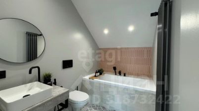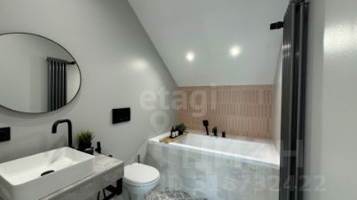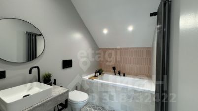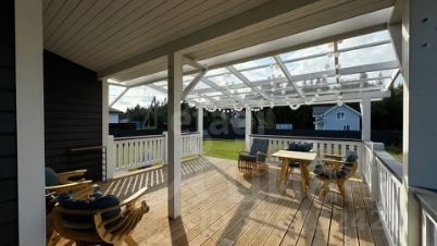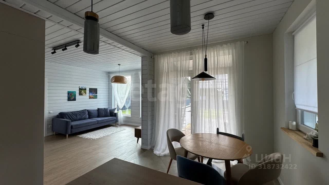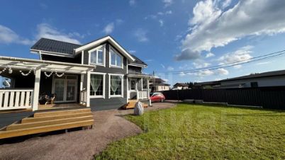 Кухня-гостиная выходит на большую террасу площадью 40 кв. м — идеальное место для летних обедов и отдыха. Участок 9 соток полностью благоустроен: ухоженный газон, дренажная система по периметру, трехкамерный септик с насосами, станция биологической очистки на 2000 л.