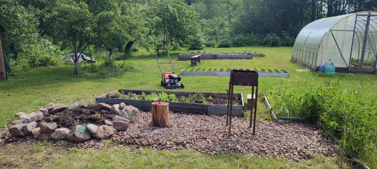 Три теплицы размером 3*4 м с растущими в них томатами, перцами, огурцами, дынями, пекинской капустой и 10 грядок (4 из которых с клубникой), чесноком,луком,кабачками находятся в центре участка. Земля плодородная, получили отличный урожай в этом году.