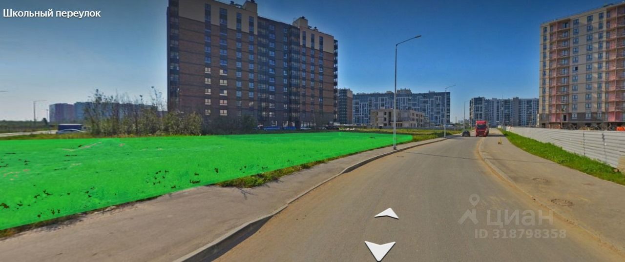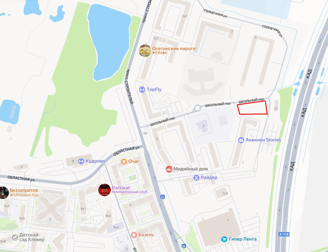 Участок расположен в густонаселенном районе, с хорошим пешеходным и автомобильным трафиком, г. Кудрово на пересечении Школьного переулка и Солнечной ул.