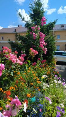 Перед домом и за домом благоустроены земельные участки, имеются плодовые и декоративные деревья и кустарники, многолетние цветы. Плиткой выложены дорожки, посадки отделены бордюрами.