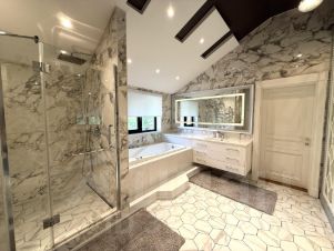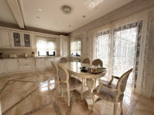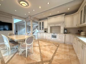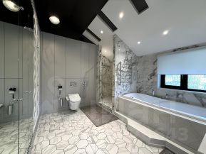 При выборе внутренней отделки использовались качественные и редкие материалы. Встроенная мебель по индивидуальному заказу. Шикарные санузлы с японской сантехникой. Бытовая техника премиум класса.