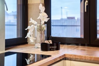 Удобная кухня с собственной кладовой и мойкой у окна, полностью оборудована качественной бытовой техникой.