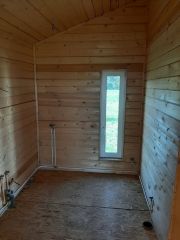 Дом внутри требует установки дверей и финишного покрытия пола.