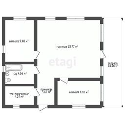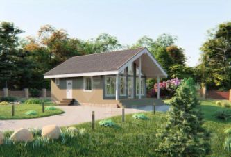 Мягкая кровля и стены с отделкой из окрашенной имитации бруса. Панорамное остекление с выходом на террасу.