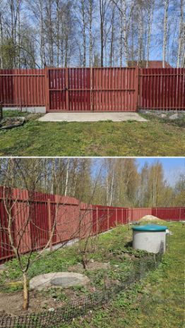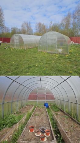 Участок ровный, правильной формы, огорожен забором (штакетник), на участке два больших парника, хоз постройка.