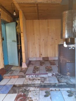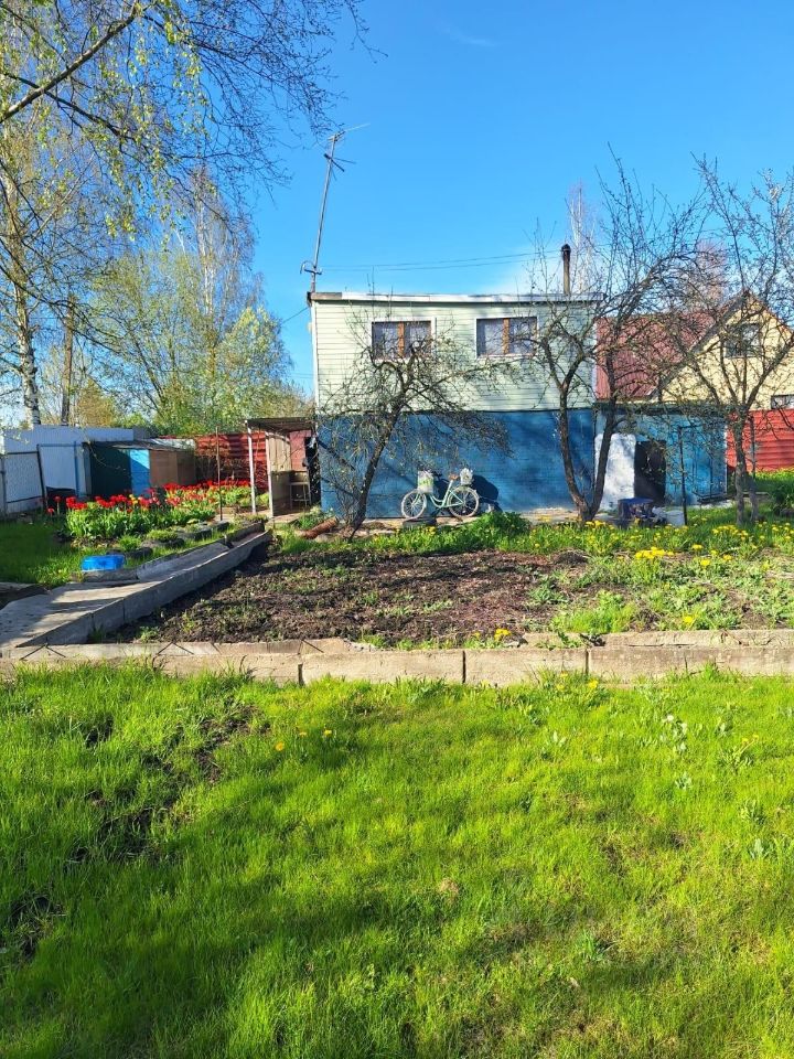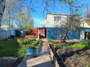 Дом - на первом этаже гараж, на втором комната. Банька (маленькая). Плодовые деревья и кустарники, цветы. Участок разработанный!