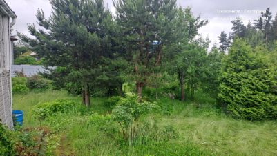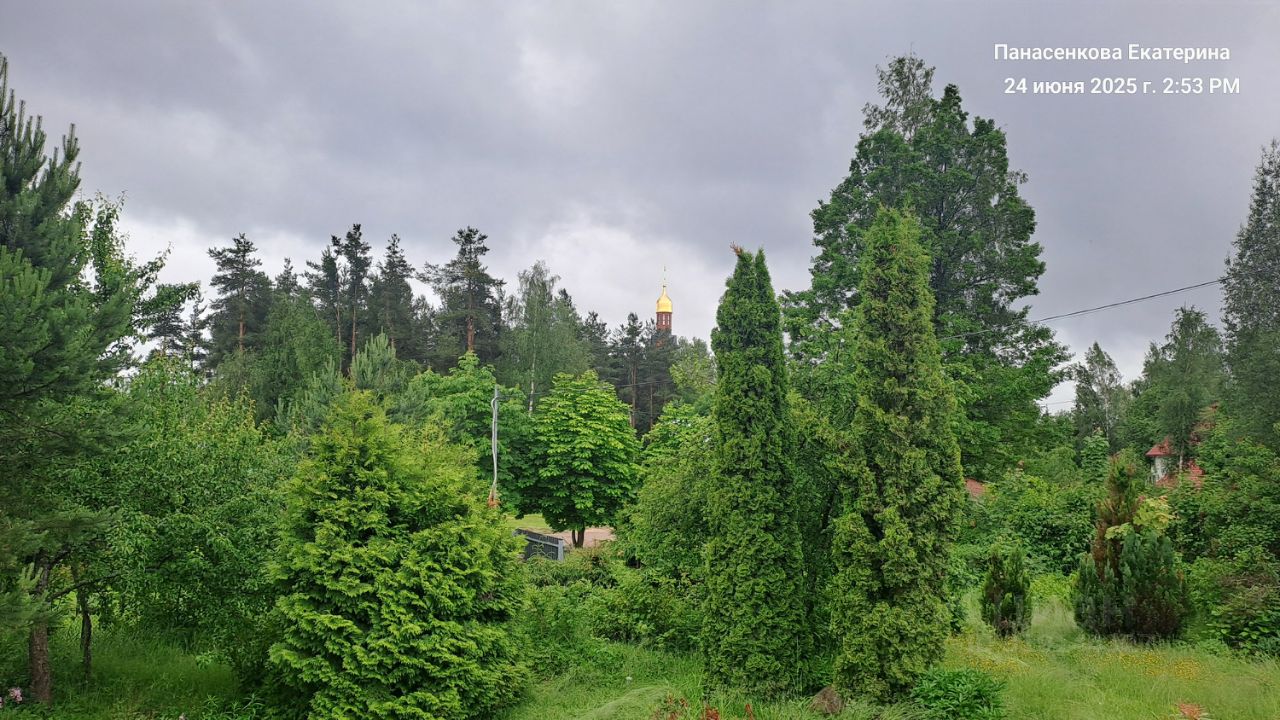 Участок очень уютный, благодаря неправильной форме. С крыльца дома открывается шикарный вид: среди макушек сосен красуется золотой купол храма Архангела Михаила.