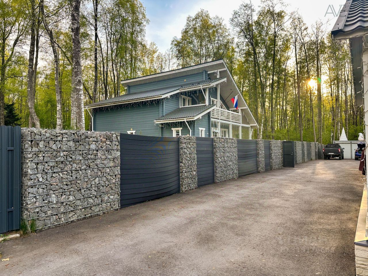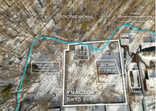 Участок частично благоустроен (ландшафтный дизайн, автополив Hunter), частично — естественный ландшафт с ягодами и грибами. Заведен ручей, на который открывается вид с дома, террасы и бани.