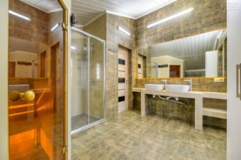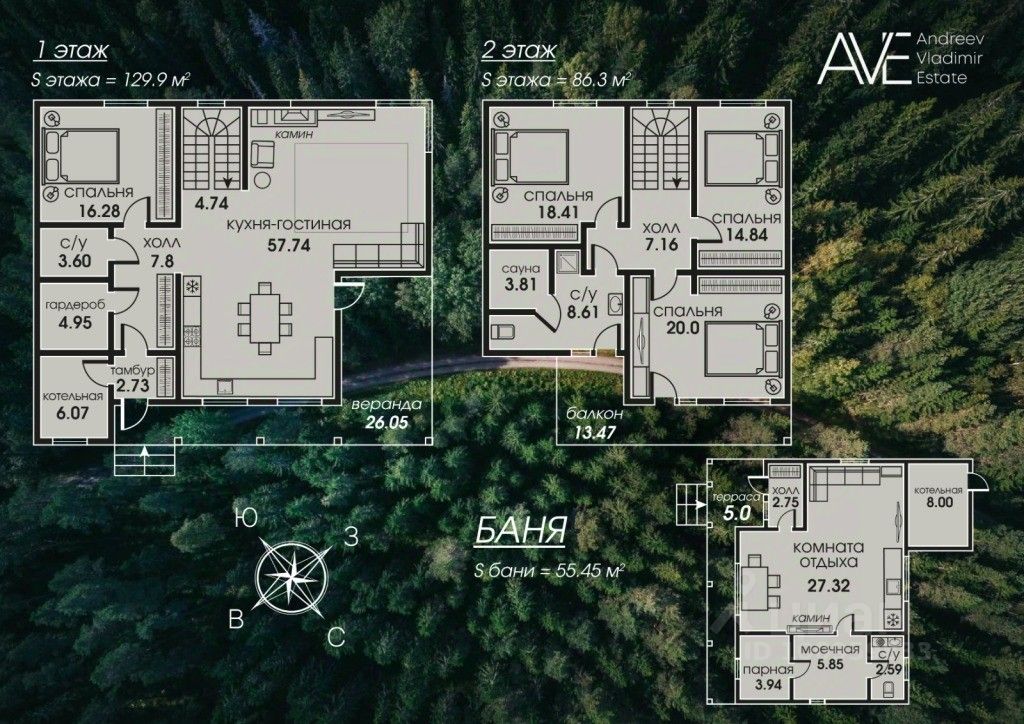 2 этаж: хозяйская спальня с видом на озеро и балконом, санузел с душем и сауной (тоже с выходом на балкон), две детские спальни.