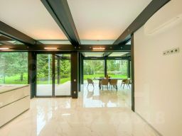 Идеально вписанный в природный ландшафт коттеджного поселка, этот дом сочетает строгую геометрию современного дизайна с теплом натуральных материалов. Панорамные окна наполняют интерьер естественным светом и открывают захватывающие виды на пруд и живописный участок площадью 18 соток.