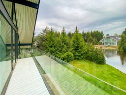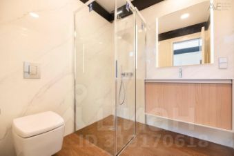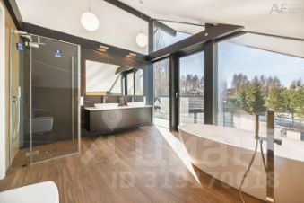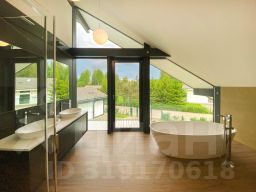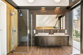 Второй этаж: мастер-спальня с балконом, с которого отрывается завораживающий вид на пруд, с большим гардеробом и дизайнерским санузлом с панорамным остеклением, в котором есть ванна, душ, биде и раковина, и еще две спальни с гардеробами, балконами и с санузлами каждая.