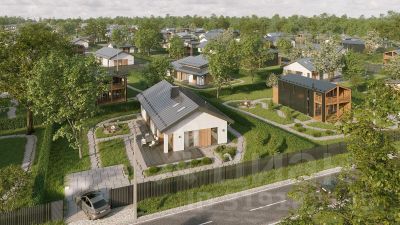 Коттеджный посёлок выполнен в едином дизайн-коде, в гармонии с окружающей природой. При прокладке дорог и коммуникаций застройщик бережно сохранил деревья (в основном - березы), южная сторона посёлка граничит с полями, выходящими к реке Ижора.