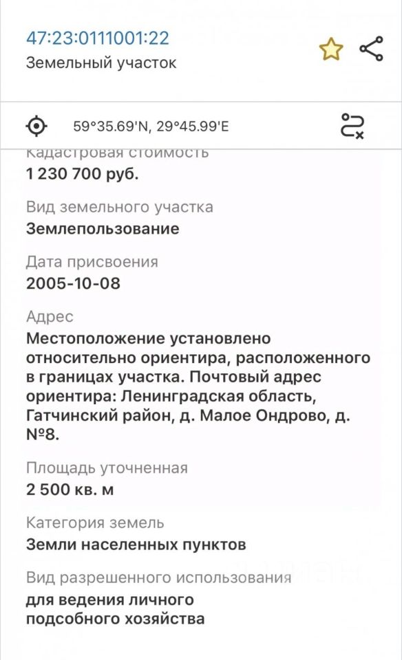 Пpедлагается к продаже зeмельный участок 25 соток Лен.обл. Гатчинский р-он д.Малое Ондрово. Собственность. Категория земель: земли населенных пунктов. Вид разрешенного использования: ЛПX. Участок ровный, прaвильной формы, разработан. Электричество подключено 15КВт.Участок расположен в маленькой тихой деревне. Рядом лес грибы ягоды. Дорога асфальт, грунтовой меньше километра. Магазин в соседней деревне Б. Ондрово, Соседи, спокойные, доброжелательные. Документы готовы к сделке. Один взрослый собственник. Кадастровый номер: 47:23:0111001:22.