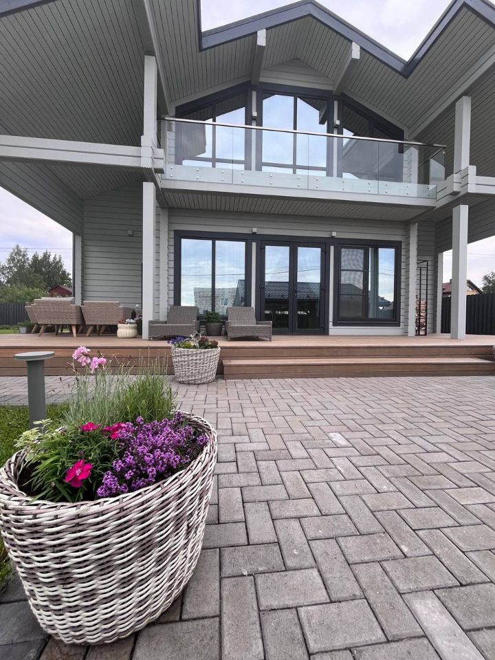 Парковка, пандус, площадка перед домом, отмостка - брусчатка.