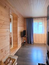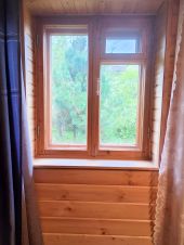 - На 1-ом этаже в комнатах сделан качественный ремонт. Установлены качественные деревянные стекло пакеты. Пол поднят, утеплен, в одной комнате качественная напольная доска, в двух других комнатах ламинат. Но остались стройматериалы, новый стеклопакет в кухню, которые остаются новому собственнику в подарок.