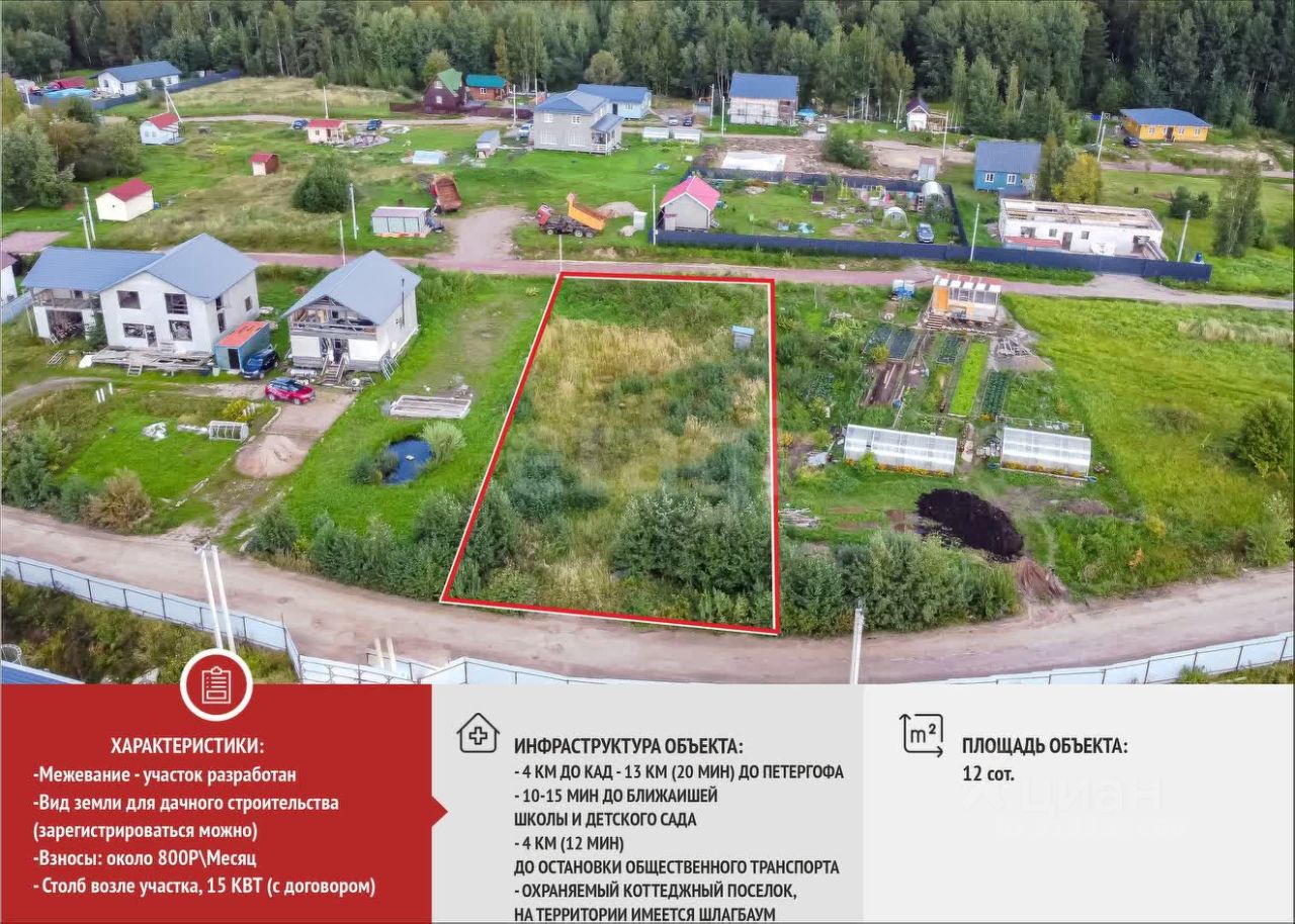 Земельный участок площадью 12 соток всего в 2км от КАД! Не упустите возможность стать владельцем недвижимости в живописном и спокойном районе, всего в 10 минутах от города!