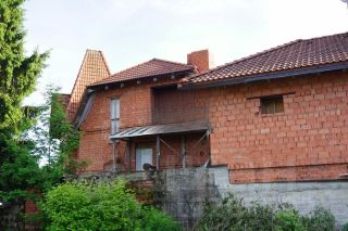 На территории находится деревянный дом пригодный для проживания на время достройки кирпичного дома и оснащён: