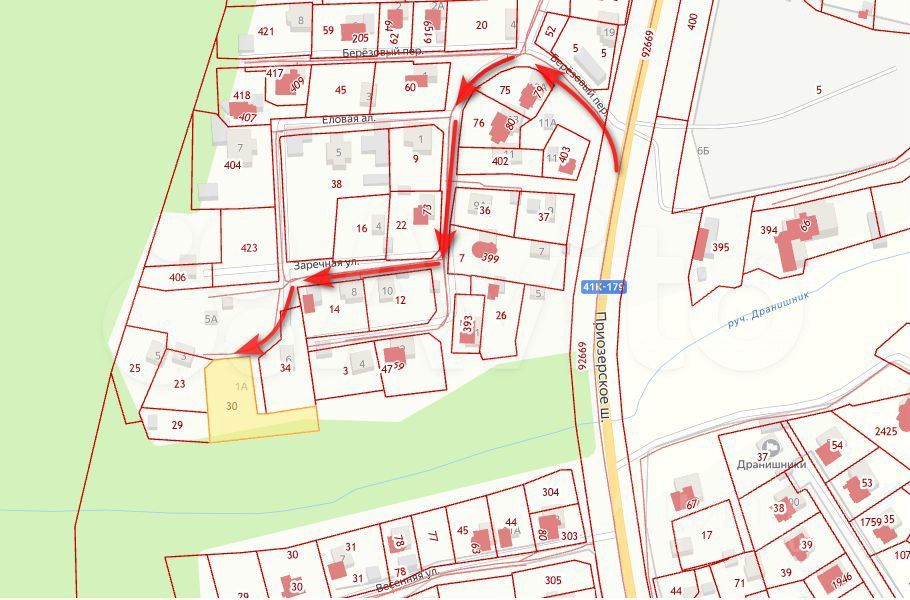 Дo Приoзеpскогo шoсce - 200 мeтpoв пo aсфальтовой дoрoге, мимo дpугиx учacткoв.