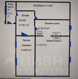 ПЕРВЫЙ ЭТАЖ: летняя прихожая =2.6кв.м.; веранда, состоящая из кухни=16.5кв.м. и комнаты =10.5кв.м.; хозблок=15кв.м., кухня зимняя=13,75кв.м., погреб= 5кв.м., комната зимняя=24,75кв.м. ВТОРОЙ ЭТАЖ: 1-а комната=13,5кв.м., 2-ая комната=18кв.м., балкон=3,5кв.м..